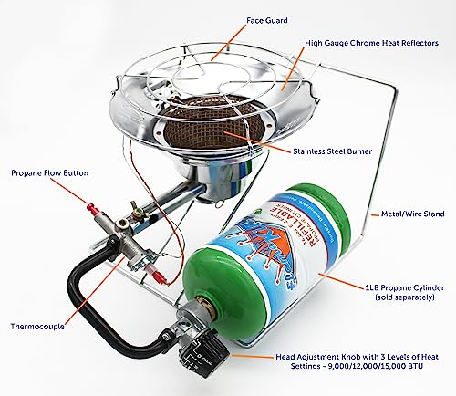 HIGH GAUGE CHROME HEAT REFLECTORS and stainless burners heat up to 15,000 BTU and last up to 2 hours with a 1LB propane cylinder