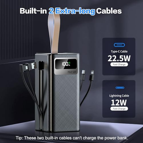 Power Bank 60000mAh High Capacity Portable Charger, 22.5W PD Fast Charging Built in Cables Battery Pack, 7 Outputs & 3 Inputs, Flashlight and LCD Display Power Bank for iPhone, Android, Camping