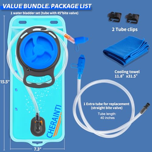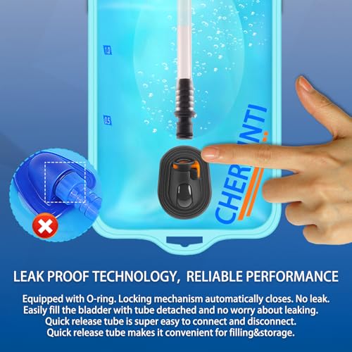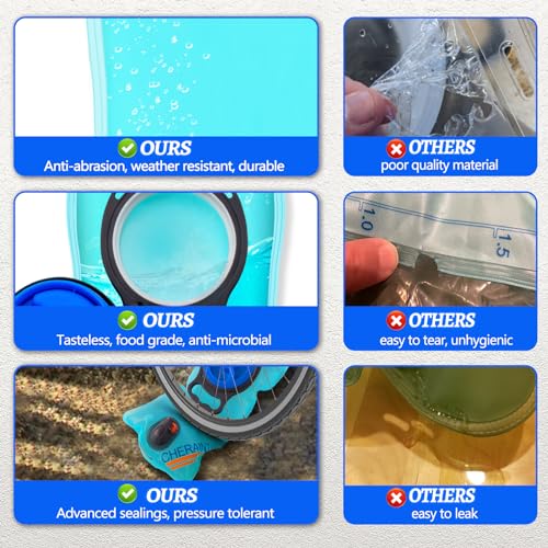 [HIGH QUALITY MATERIALS ENSURE HEALTH AND SAFETY] Our hydration bladder has undergone rigorous testing, the entire material is food-grade, BPA free, odorless. The interior is smooth, making the bladder easy to maintain and keeping water always clean. Utilizing double-sealed edges, the water bladder has excellent pressure-resistant and leak-proof performance. CHERAINTI water reservoir is military-grade, durable and reusable. You can use it with complete confidence.