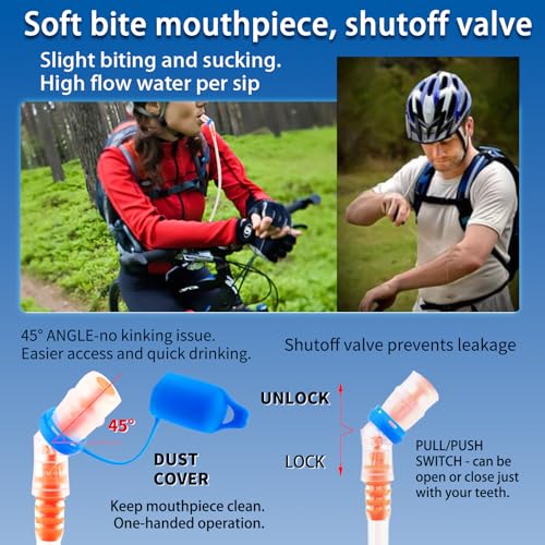 [ERGONOMIC BITE VALVE, HIGH FLOW WATER] The 2 liter hydration bladder features a 45 degree angled bite valve with a pull/push switch. The design allows you to easily grip the mouthpiece, just open or close the water valve using your teeth. The mouthpiece is soft and comfortable to bite, enabling you to effortlessly drink a good amount of water. Another thoughtful design is the dust cover which help to keep mouthpiece clean during outdoor use.