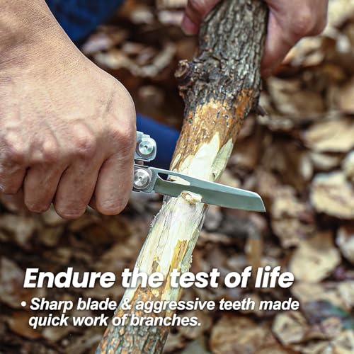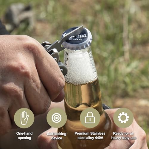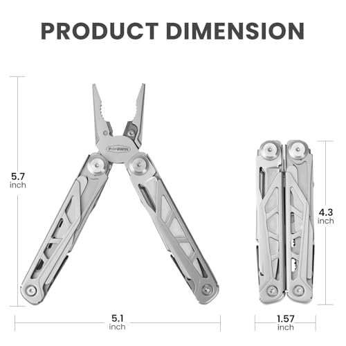 【SLIM DESIGN】This multi-tool measures 4.3 inches long, 1.57 inches wide, 0.78 inches thick, and weighs 0.66 pounds, you can access and open the multi tool pocket knife with a single hand. We offer a hard-wearing nylon sheath for convenient carrying it on a belt or a pack strap. The pocket multitool a high-grade metal rivet snap closes tightly and keeps your tool secure.