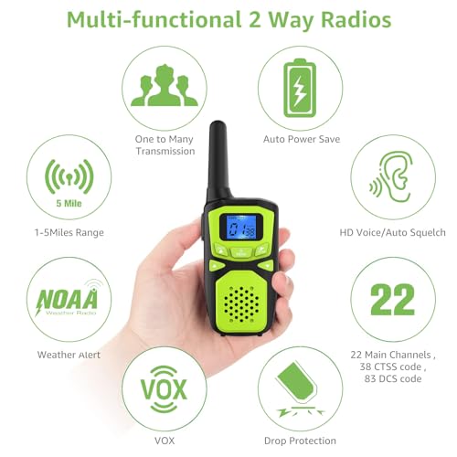 【BEST GIFT FOR YOUNG AND OLD】 – Long range kids walkie talkies bring more fun to communicate with your kids, friends and parents. Get ready for outdoor living, hiking, camping, hunting, skiing and biking and stay connected at all times.