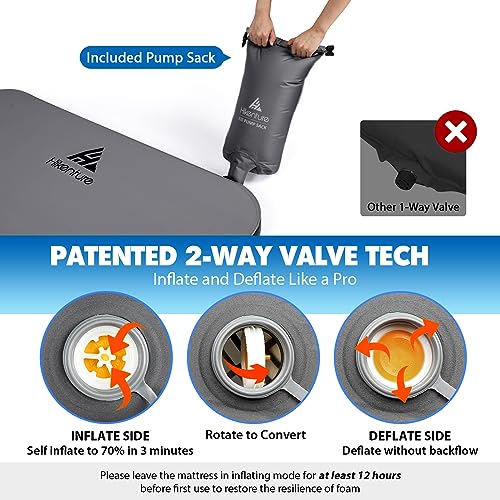 👍 𝐒𝐀𝐕𝐄 𝐘𝐎𝐔𝐑 𝐓𝐈𝐌𝐄 𝐀𝐍𝐃 𝐁𝐑𝐄𝐀𝐓𝐇 𝐓𝐎 𝐈𝐍𝐅𝐋𝐀𝐓𝐄 – Our self-inflating truck bed mattress comes with a patented 2-way valve and makes inflating & deflating a breeze. Just several minutes for it to self inflate and a few bags of air added with the included pump sack, a comfy camping mattress’s done. Flip the valve to deflating side and the valve will stop air from getting back to ensure an easier deflation.