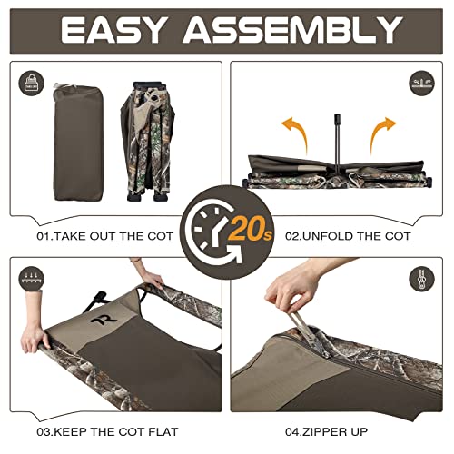 【STRONG AND STURDY 】TR chooses built-to-last strong steel frame and wear-resistant camouflage fabric for thhis cots outdoor.The reinforced steel legs strengthens the the tightness of the cot and also provides stability; camping cots for adults most comfortable for heavy people makes camping easily.Durable steel frame can support up to 225 lbs,weights 12.4lbs.