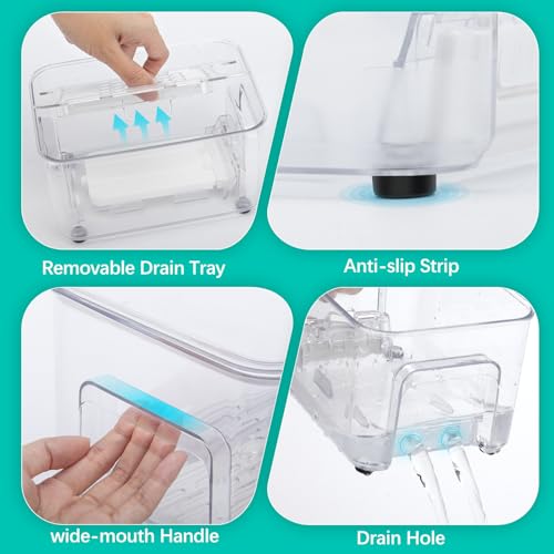REMOVABLE DRAIN TRAY – Our produce saver containers for refrigerator has drain tray which lifts food away from moisture and promotes proper airflow, Keeps vegetables and fruits separately out of drippings, also keeps meat and fish separately out of thaw water. And the drain holes on the side bottom can be easily opened to drain excess water.