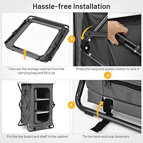 【Easy to Set up and Take Down】: The cabinet is easy for you to open, setup and close in less than a minute. Take out the storage cabinet from the carrying bag and lift it up, then press the hasp and plastic button to lock it, tie the hook and loop fasteners and finally put the top board and shelf in.