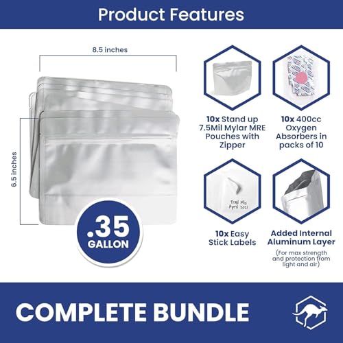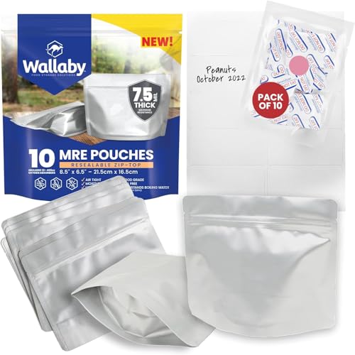 Wallaby MRE Mylar Bag Bundle – 10x (7.5 Mil – 6.5″ x 8.5’’) Stand-Up Zipper Pouches, 10x 400cc Oxygen Absorbers – Heat Sealable & Withstand Boiling Water – Long-Term Food Storage Solutions – Silver