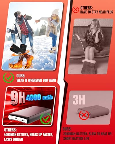 🏂【𝗟𝗢𝗡𝗚-𝗟𝗔𝗦𝗧𝗜𝗡𝗚 𝗕𝗔𝗧𝗧𝗘𝗥𝗬】Battery socks are equipped with two 4000mAh super-capacity batteries, battery capacity is more than twice the 2000mAh battery of other traditional heated women socks, which provide up to 10 hours of warmth. Dual-terminal Type-C charging can charge your men/women socks at the same time without wasting your time. Electric ski socks help those people who with arthritis foot and Chronically Cold Feet and Stiff Joints.
