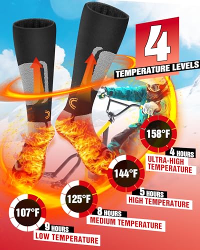 🏂【𝟰 𝗟𝗘𝗩𝗘𝗟 𝗧𝗘𝗠𝗣𝗘𝗥𝗔𝗧𝗨𝗥𝗘】Heated socks have 4 temperature settings, including Ultra-high temperature158°F, high temperature144°F, medium temperature125°F and low temperature107°F. You can set 4 temperature levels at will, making electric heated socks an ideal choice for keeping your feet warm in winter.