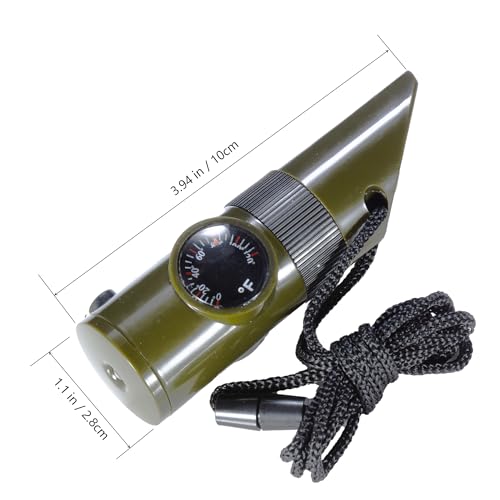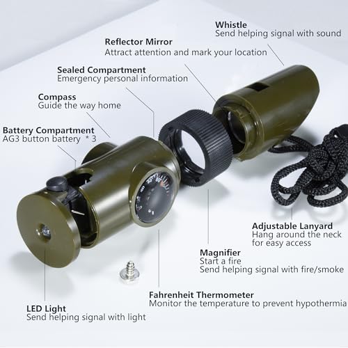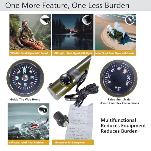 【Multi-functional Design】This outdoor survival whistle is made of high-strength, impact-resistant, heat-resistant, and corrosion-resistant ABS engineering material, ensuring durability. It includes 7 functions such as a high-decibel survival whistle, LED signal flashlight, emergency fire starter magnifying glass, waterproof emergency information storage compartment, reflector signal mirror, compass, and fahrenheit thermometer, making it a versatile survival tool.